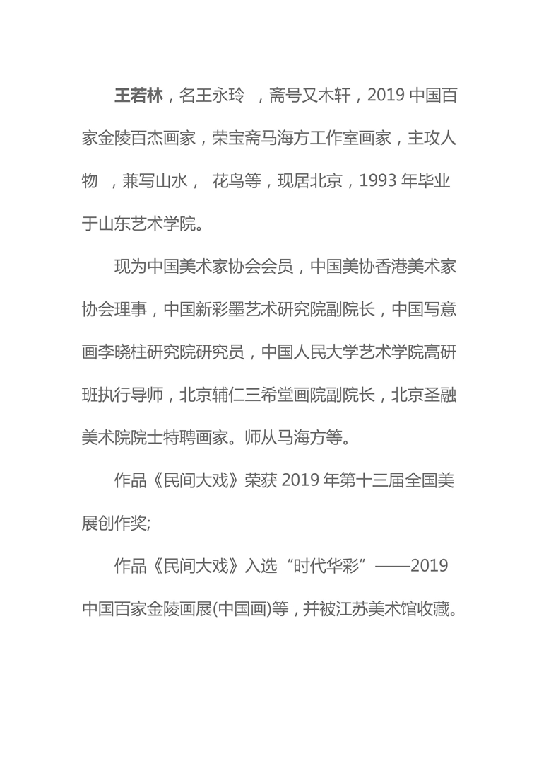 王若林,名王永玲 ,斋号又木轩,2019中国百家金陵百杰画家,荣宝斋马海方工作室画家,主攻人物 ,兼写山水, 花鸟等,现居北京,1993年毕业于山东艺术学院。