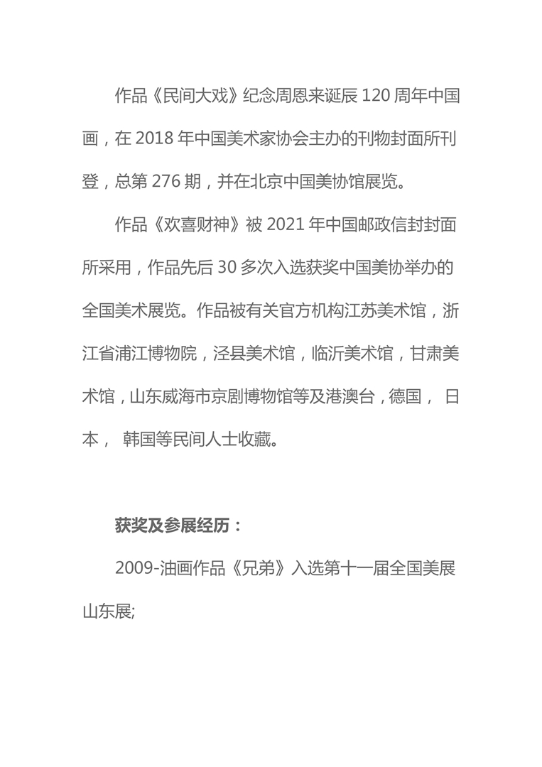 作品《欢喜财神》被2021年中国邮政信封封面所采用,作品先后30多次入选获奖中国美协举办的全国美术展览。作品被有关官方机构江苏美术馆,浙江省浦江博物院,泾县美术馆,临沂美术馆,甘肃美术馆,山东威海市京剧博物馆等及港澳台,德国, 日本, 韩国等民间人士收藏。