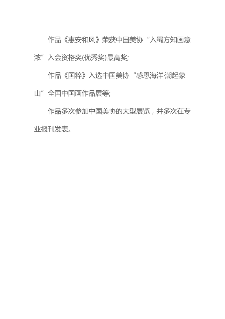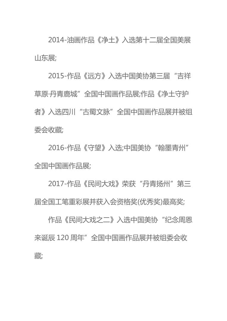 2015-作品《远方》入选中国美协第三届“吉祥草原·丹青鹿城”全国中国画作品展;作品《净土守护者》入选四川“古蜀文脉”全国中国画作品展并被组委会收藏;