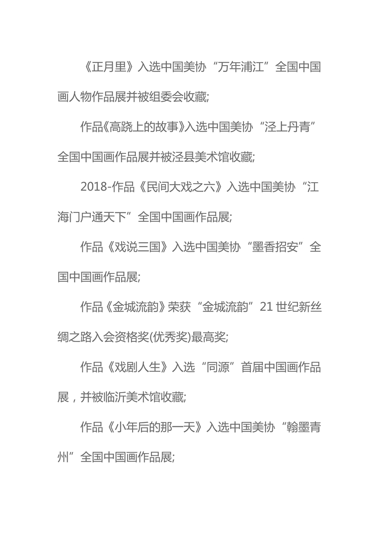 作品《民间大戏》入选“时代华彩”——2019中国百家金陵画展(中国画)等,并被江苏美术馆收藏。